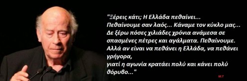 «Ξέρεις κάτι; Η Ελλάδα πεθαίνει. Πεθαίνουμε σα λαός. Κάναμε τον κύκλο μας. Δεν ξέρω πόσες χιλιάδες χρόνια. ανάμεσα σε σπασμένες πέτρες και αγάλματα και πεθαίνουμε. Αλλά αν είναι να πεθάνει η Ελλάδα, να πεθάνει γρήγορα. Γιατί η αγωνία κρατάει πολύ, και κάνει πολύ θόρυβο.», είχε πει ο αείμνηστος Θανάσης Βέγγοςστην ταινία, Το Βλέμμα του Οδυσσέα. Τα λόγια του ίσως μοιάζουν πιο επίκαιρα από ποτέ.